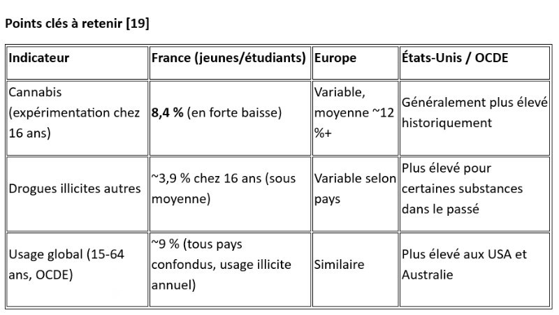 Par comparaison, aux États-Unis -même si les données varient selon les années et les études- le taux d’usage expérimental de drogues illicites (toutes confondues) chez les étudiants américains est historiquement plus élevé qu’en Europe, 35 % contre 18 %. Bien qu’il y ait une tendance à la hausse en Europe, l’usage de certaines substances aux Etats-Unis comme les amphétamines et l’ecstasy reste encore nettement plus élevé que la moyenne européenne [14]